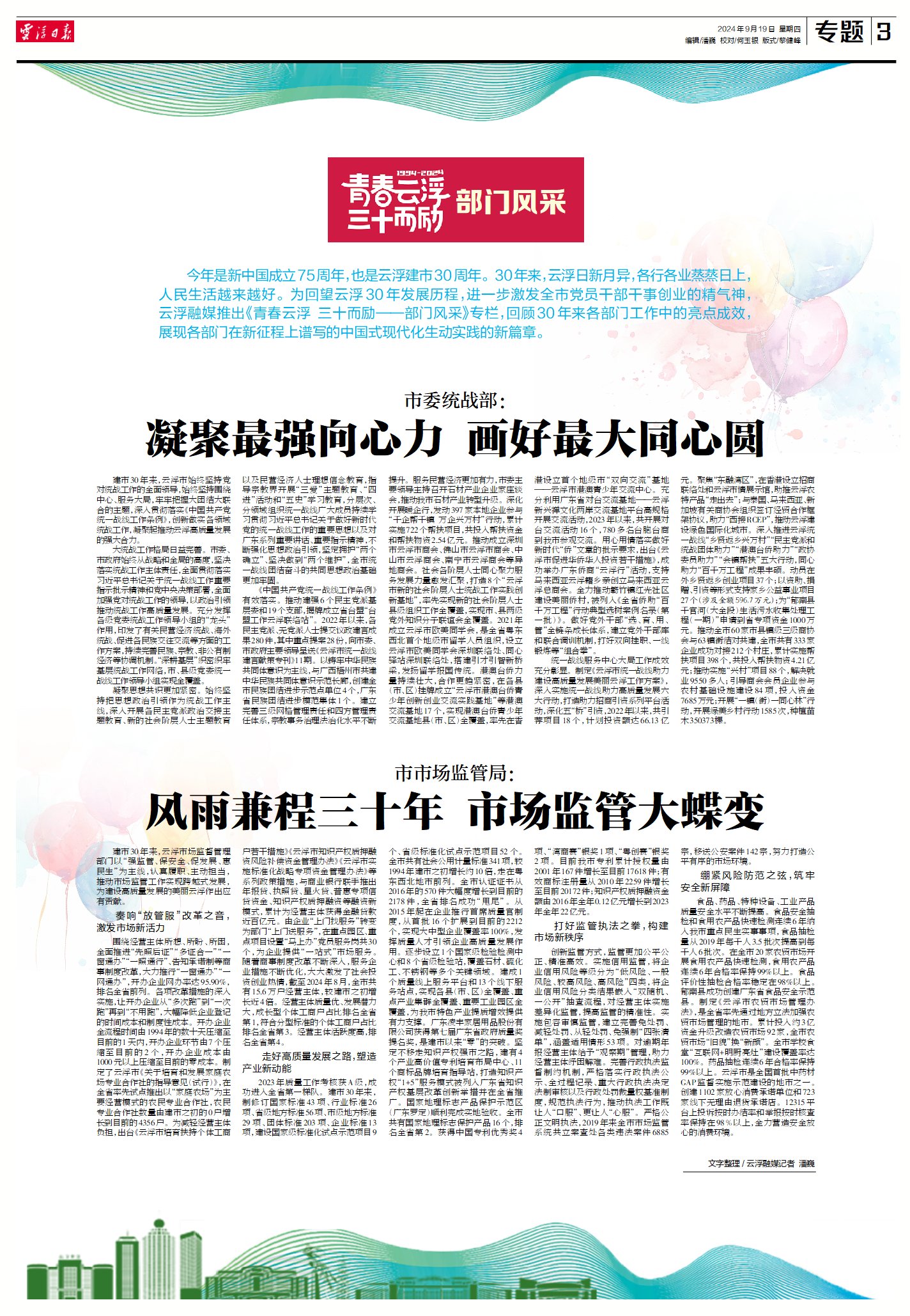 今年是新中国成立75周年,也是云浮建市30周年。30年来,云浮日新月异,各行各业蒸蒸日上,人民生活越来越好。为回望云浮30年发展历程,进一步激发全市党员干部干事创业的精气神,云浮融媒推出《青春云浮 三十而励——部门风采》专栏,回顾30年来各部门工作中的亮点成效,展现各部门在新征程上谱写的中国式现代化生动实践的新篇章。
