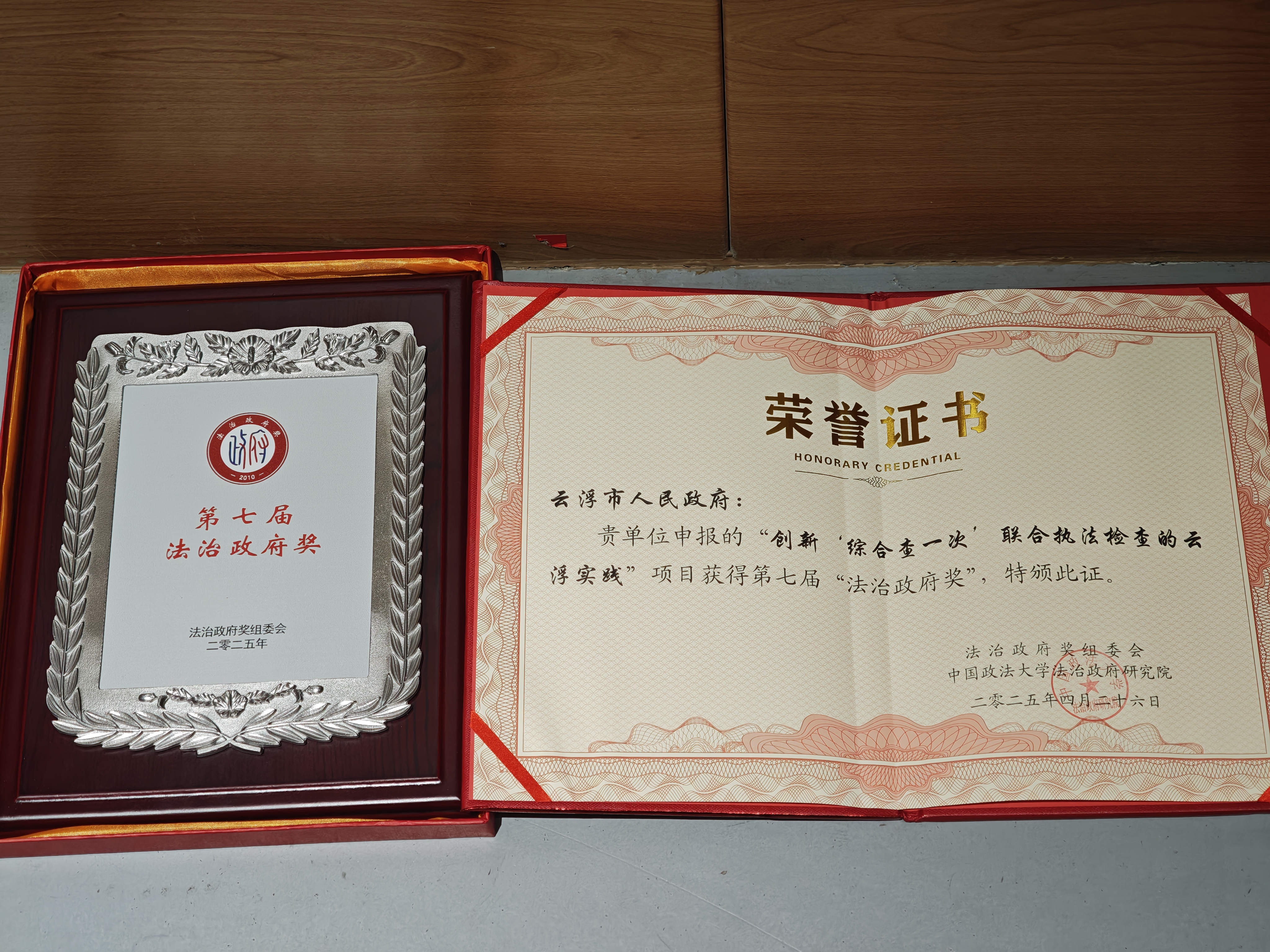 6月15日,第七届“法治政府奖”颁奖典礼在中国政法大学举办,为全国20个“法治政府奖”和20个“法治政府提名奖”颁奖。其中,广东省云浮市申报的《创新“综合查一次”联合执法检查的云浮实践》获“法治政府奖”,成为广东省唯一获该奖项的地级市创新项目。云浮市有关领导率队参加颁奖典礼并领奖。