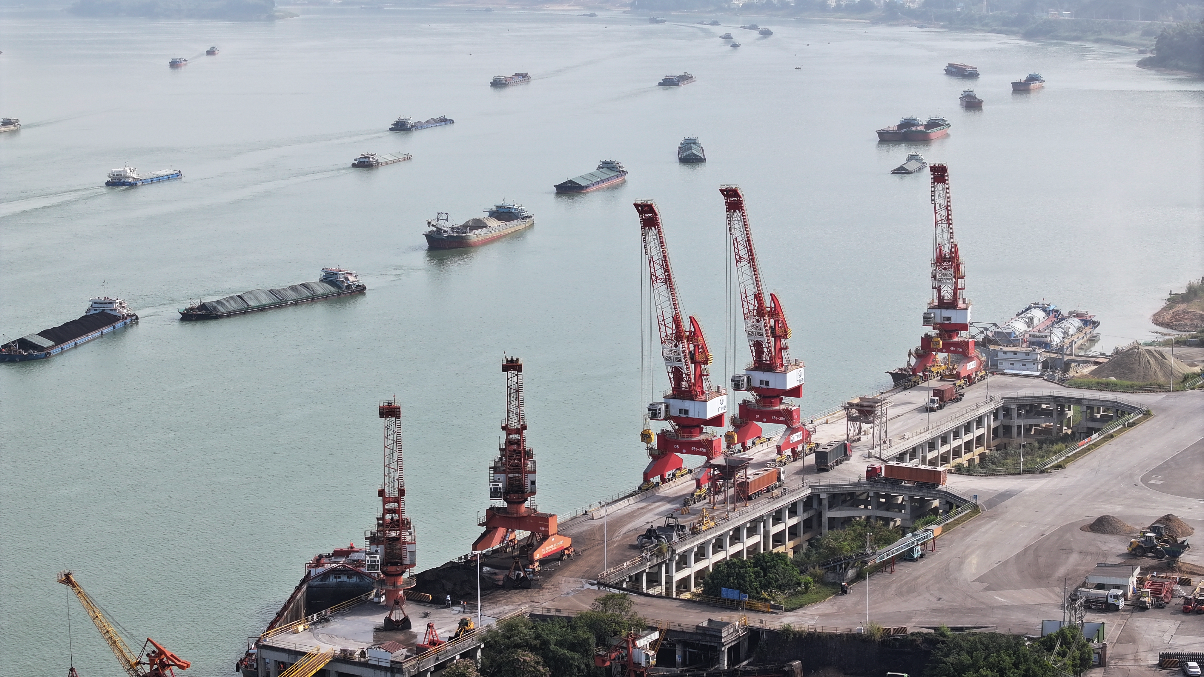 28日,记者在港口码头现场看到,吊机高耸,车辆穿梭,集装箱整齐堆放,工人们正有序进行煤炭、粮食、集装箱等货类的装卸作业。一艘满载集装箱的货轮缓缓靠岸,集装箱通过门机和场内拖车的精准配合,迅速转运至堆场,整个流程高效顺畅。据云浮港盛公司党支部书记、总经理陈建兴介绍,目前主要货类包括煤炭、粮食、纸浆、木片、钢材等,近期正积极拓展粮食、砂石等散货和集装箱业务,优化“散改集”模式,新增内贸航线,打造“一站式”物流服务。