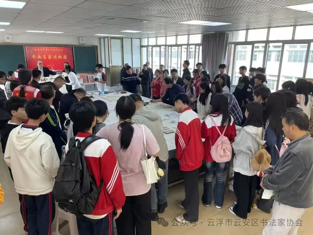 近日,云安区书协组织“乡村艺先生”参加了在云安中学举行的“艺起乡见‘百千万’系列之书画名家进校园”活动,与云安中学师生开展面对面的书法交流,这是云安区书协持续推进书法赋能“百千万工程”的又一次具体实践行动。云安区人大常委会、区文联、云浮市美协等领导、嘉宾到活动现场指导。云安区书协区负责人及部分会员与云浮市西雅房书画社部分社员一起,为云安中学师生送上一堂生动的书画艺术课。